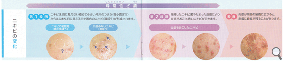 “にきび”は皮脂腺を持つ毛包に起きる病気です。 症状としては大きく二段階に分けることができます。 第一段階は面皰(めんぽう)と呼ばれ、目に見えない極めて小さい毛穴のつまりや、白にきびや黒にきびを指します。そして第二段階になると増殖したニキビ菌やたまった皮脂に炎症が起こり、赤にきびと呼ばれる症状になります。