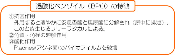 両者の違いをあげるとするならは、過酸化ベンゾイル(BPO, ベピオ®)は①P.acnes(アクネ菌)に作用して抗生物質に代わる抗菌作用を有すること、②機械的に角質の剥離作用を有することといえます。